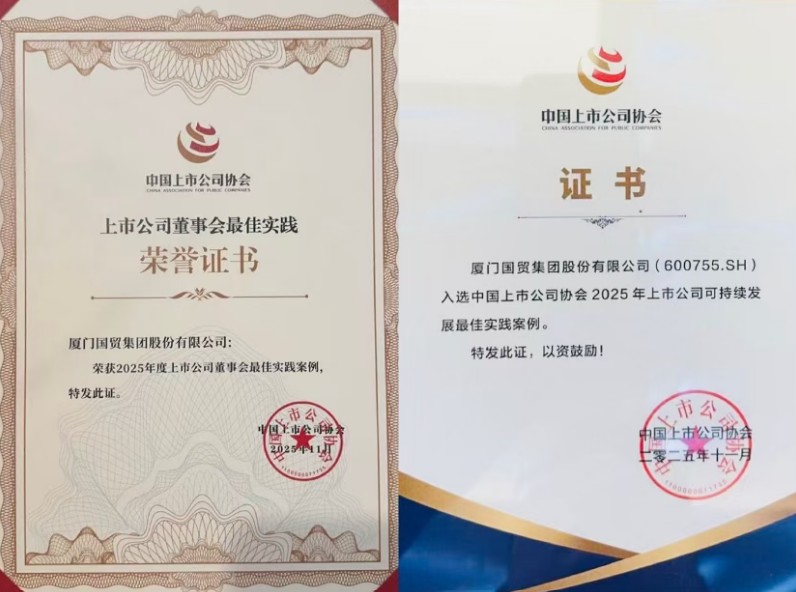 廈門(mén)國(guó)貿(mào)榮獲“2025上市公司董事會(huì)最佳實(shí)踐案例”和 “2025上市公司可持續(xù)發(fā)展最佳實(shí)踐案例”兩項(xiàng)榮譽(yù)