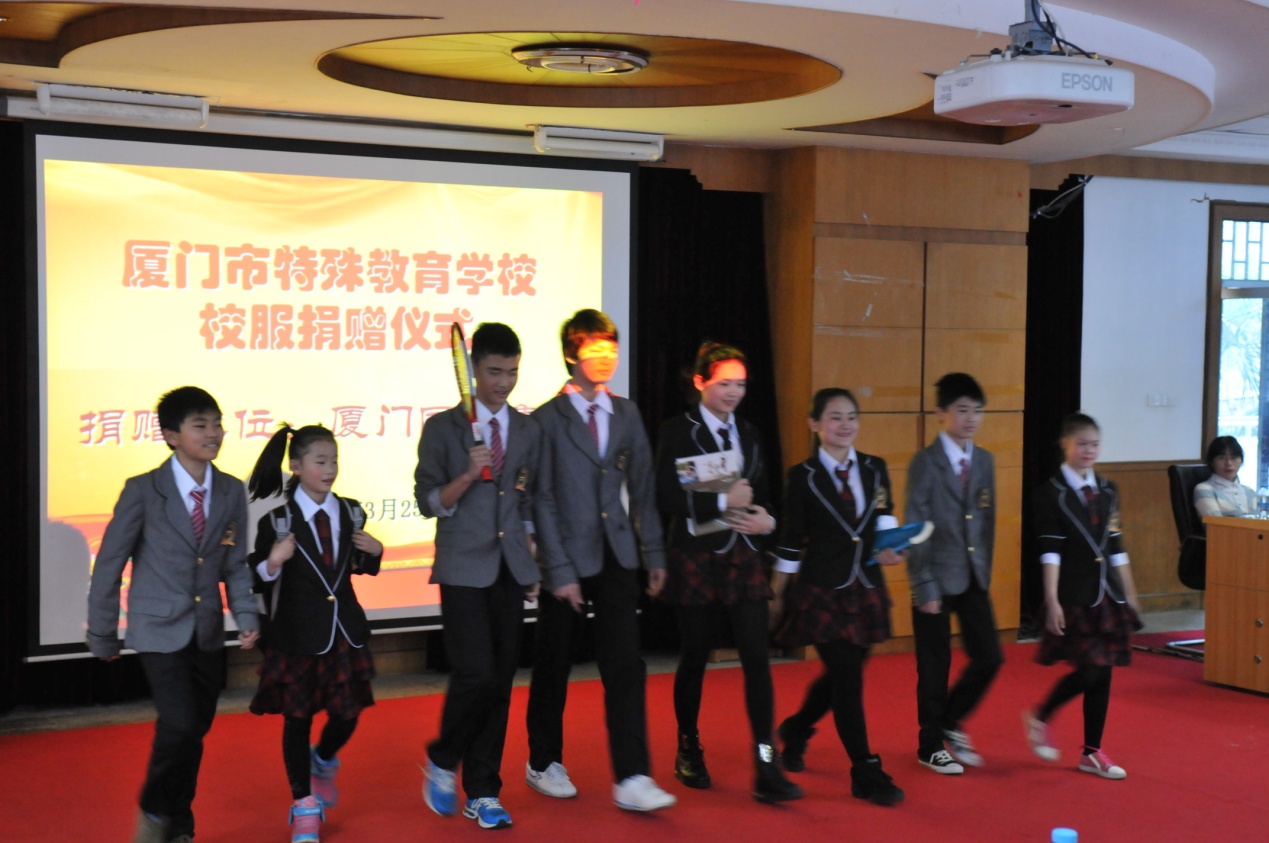 3月25日,廈門國貿(mào)愛心捐贈儀式在廈門特教學校舉行。國貿(mào)300多名黨員自愿捐款,為廈門特教學校全體學生制作一套校服。