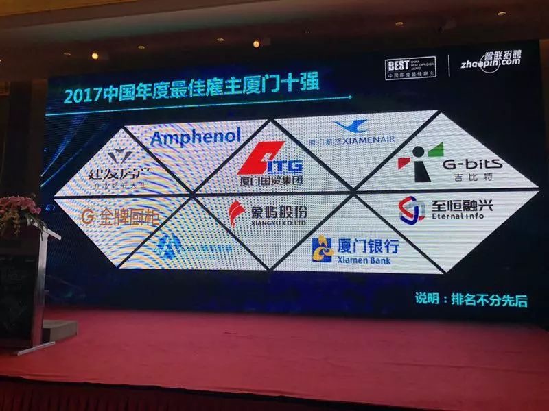 2017中國(guó)年度最佳雇主頒獎(jiǎng)盛典在廈門(mén)舉行?;顒?dòng)當(dāng)天揭曉了2017年廈門(mén)年度最佳雇主10強(qiáng),廈門(mén)國(guó)貿(mào)以絕對(duì)優(yōu)勢(shì),再次入選廈門(mén)年度最佳雇主10強(qiáng)榜單。