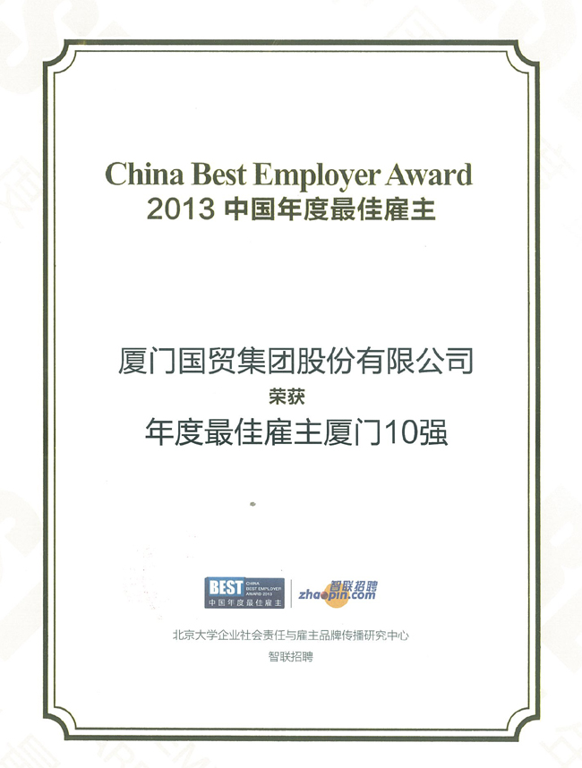 由北京大學(xué)企業(yè)社會(huì)責(zé)任與雇主品牌研究中心和智聯(lián)招聘主辦的2013中國(guó)年度最佳雇主活動(dòng)近日落下帷幕,廈門(mén)國(guó)貿(mào)榮獲廈門(mén)10強(qiáng)。