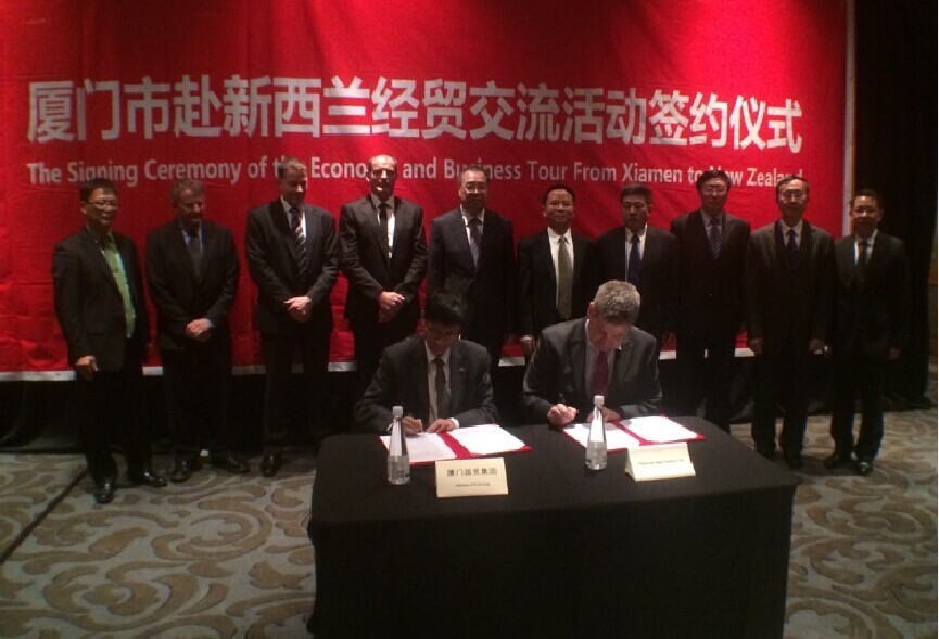 “廈門市赴新西蘭經(jīng)貿(mào)交流活動(dòng)”簽約儀式昨日在奧克蘭舉行。在市長(zhǎng)劉可清的見證下,國(guó)貿(mào)集團(tuán)董事長(zhǎng)何福龍與新西蘭合作伙伴現(xiàn)場(chǎng)進(jìn)行簽約。