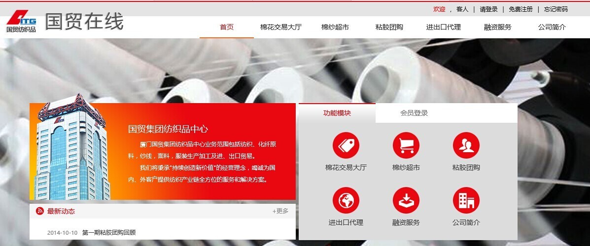 “國貿(mào)在線”是國貿(mào)紡織品中心整合線下紡織產(chǎn)業(yè)鏈的電子商務(wù)平臺,為眾多客戶提供棉花到棉紗、粘膠以及紡織品進出口代理、棉花融資等服務(wù),設(shè)置棉花交易大廳,棉紗超市,粘膠團購、進出口代理,棉花融資等欄目,吸引國內(nèi)紡織產(chǎn)業(yè)鏈客戶,通過全新的“國貿(mào)在線”商務(wù)平臺,開展真實、安全、高效、便捷的網(wǎng)上貿(mào)易,感受友好、貼心、全流程服務(wù)的用戶體驗。