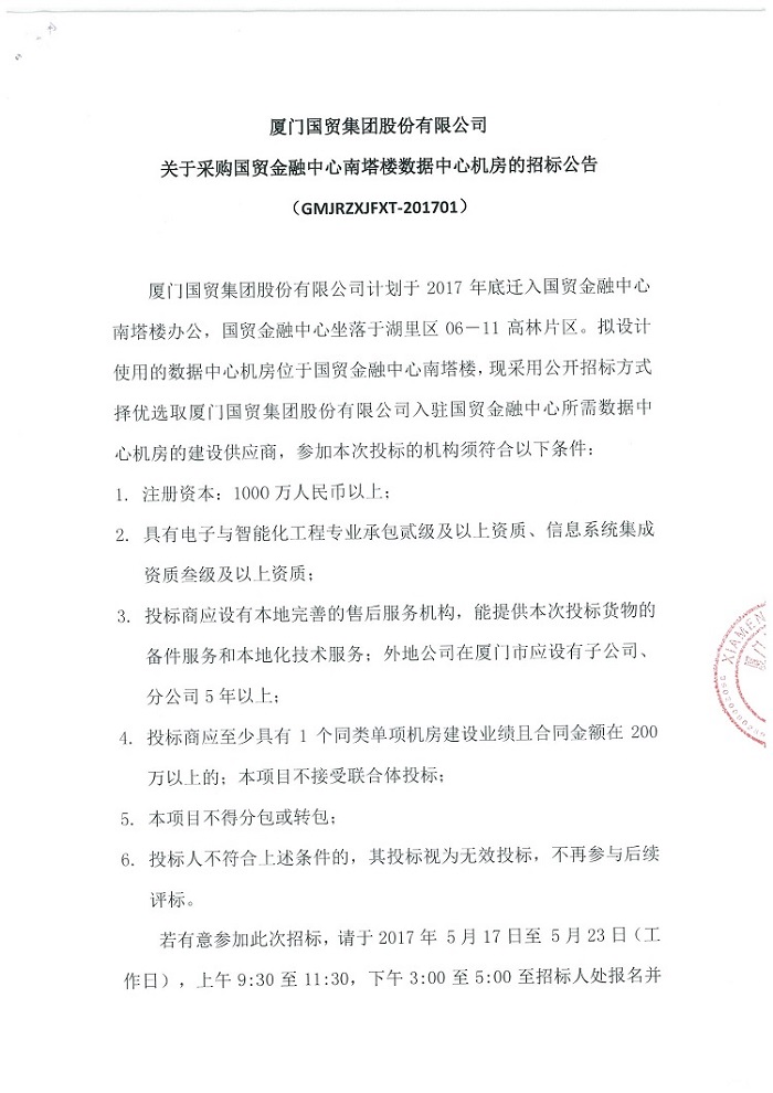 國(guó)貿(mào)金融中心機(jī)房系統(tǒng)招標(biāo)公告