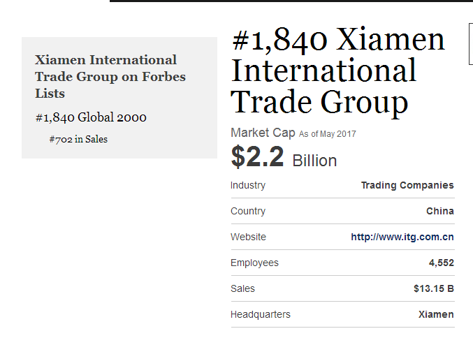 5月25日,美國《福布斯》雜志發(fā)布了2017年“全球上市公司2000強(qiáng)”排行榜,廈門國貿(mào)集團(tuán)股份有限公司位居該榜單第1840位。
